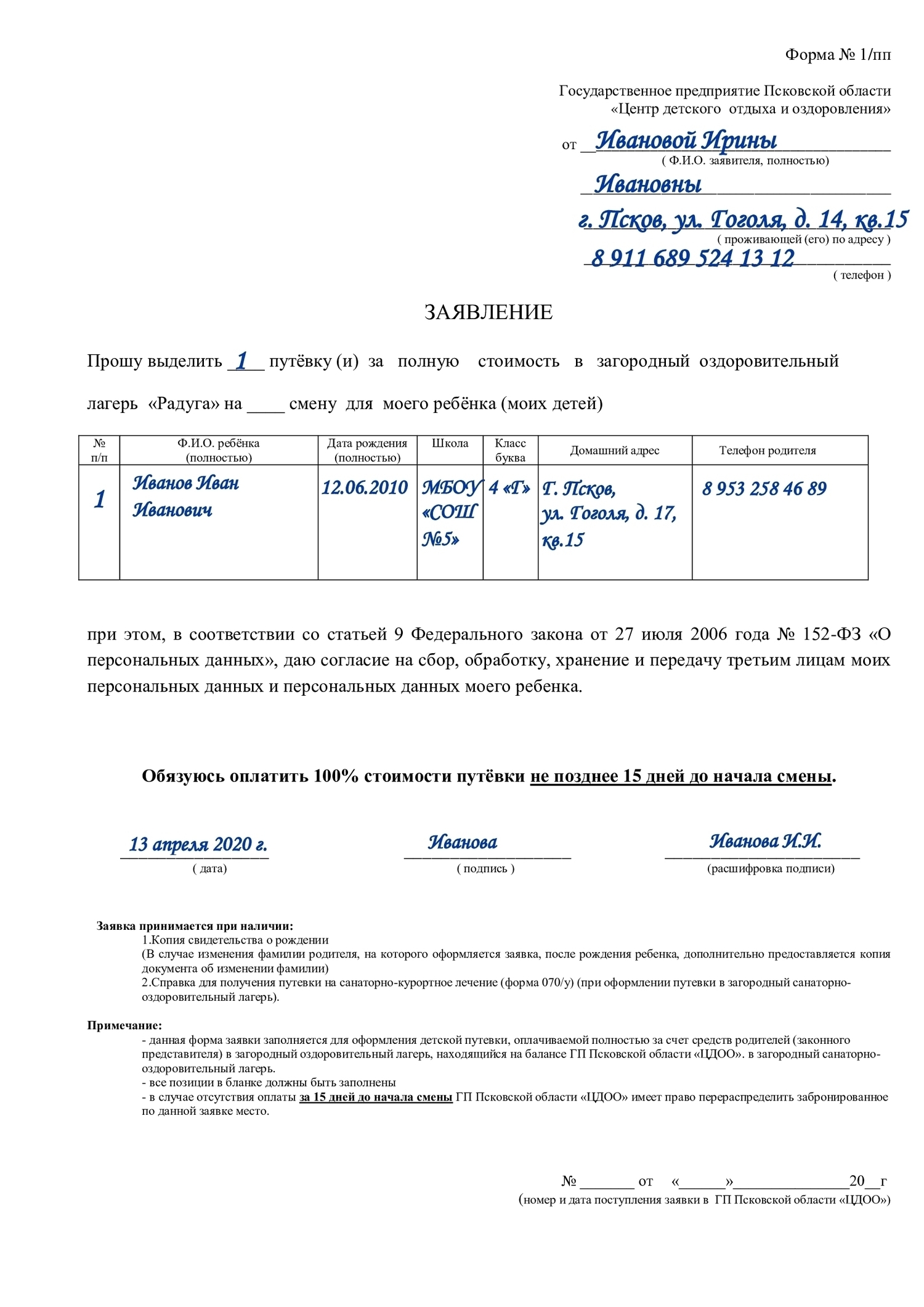 Категория "Полноплатные" - заявление "Форма №1 пп" - все позиции должны быть заполнены (ВНИМАНИЕ! не заполнять номер смены и процент оплаты путёвки) - копия свидетельства о рождении (на каждого ребёнка, указанного в заявке)* - справка со школы, где обучается ребёнок (обязательно с фотографией и датированная годом подачи заявки) Примечание:*в случае изменения фамилии родителя, на которого оформляется заявка, после рождения ребёнка, дополнительно предоставляется копия документа об изменении фамилии.