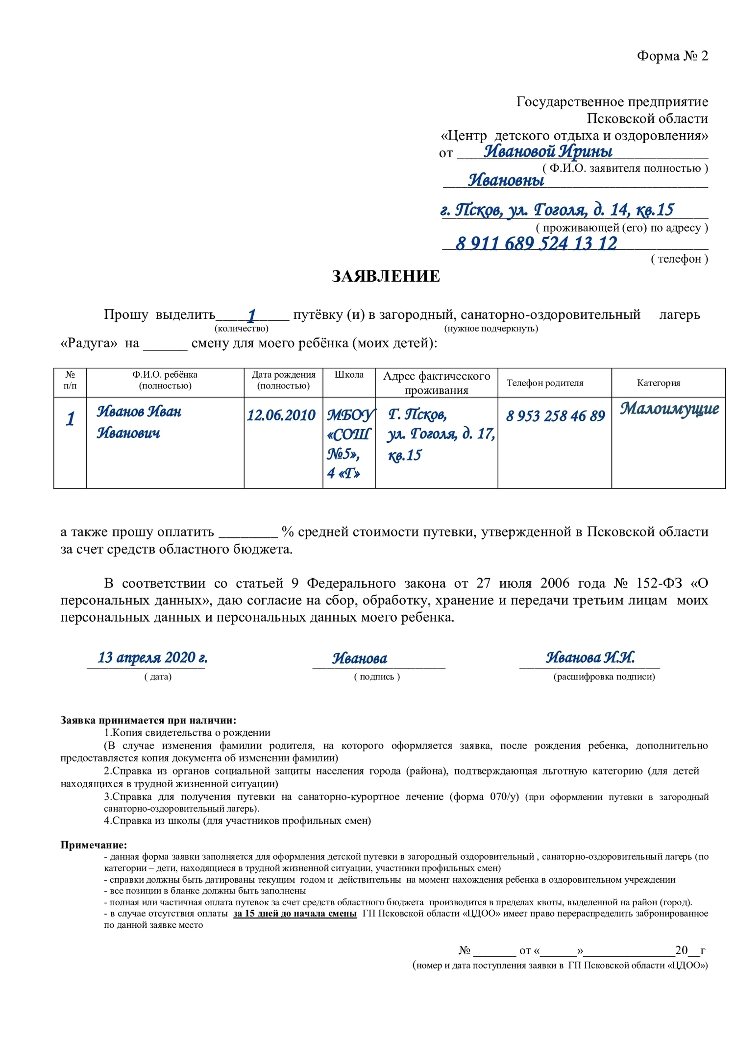 Форма полноплатной заявки. Для детей работающих граждан Форма для детей ТЖС.Образец