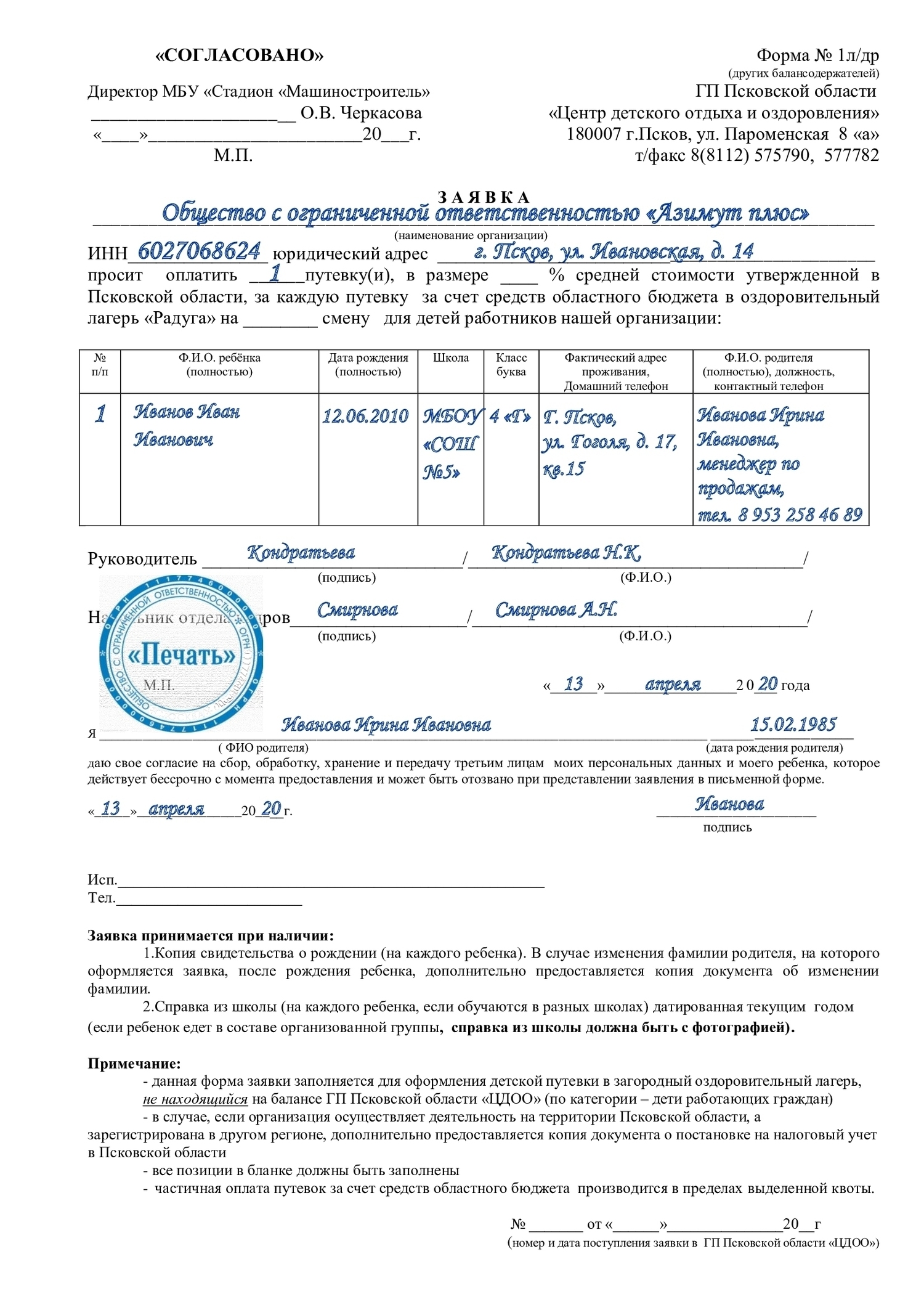 Для оформления путёвки в загородный оздоровительный лагерь "Радуга" необходимо заранее оформить и предоставить следующие документы в МБУ «Стадион «Машиностроитель» (г. Псков, ул. Кузнецкая, д.25):